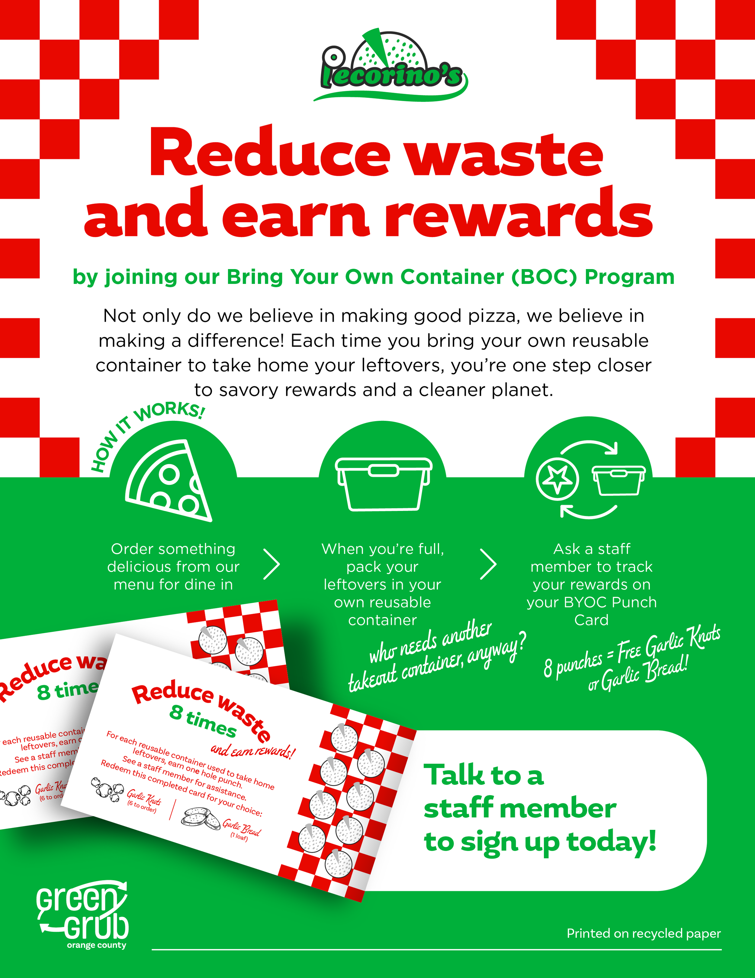 Orange County Green Grub, a voluntary program, offered FREE of cost*, is designed to support and guide local food service establishments, including restaurants and grocery stores, in implementing safe, sustainable reuse practices. With an estimated time commitment of 3-4 hours a month** over 8 months, Orange County Green Grub aims to reduce dependency on single-use items, benefiting both businesses and the surrounding community.